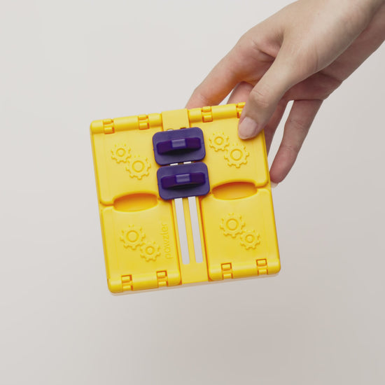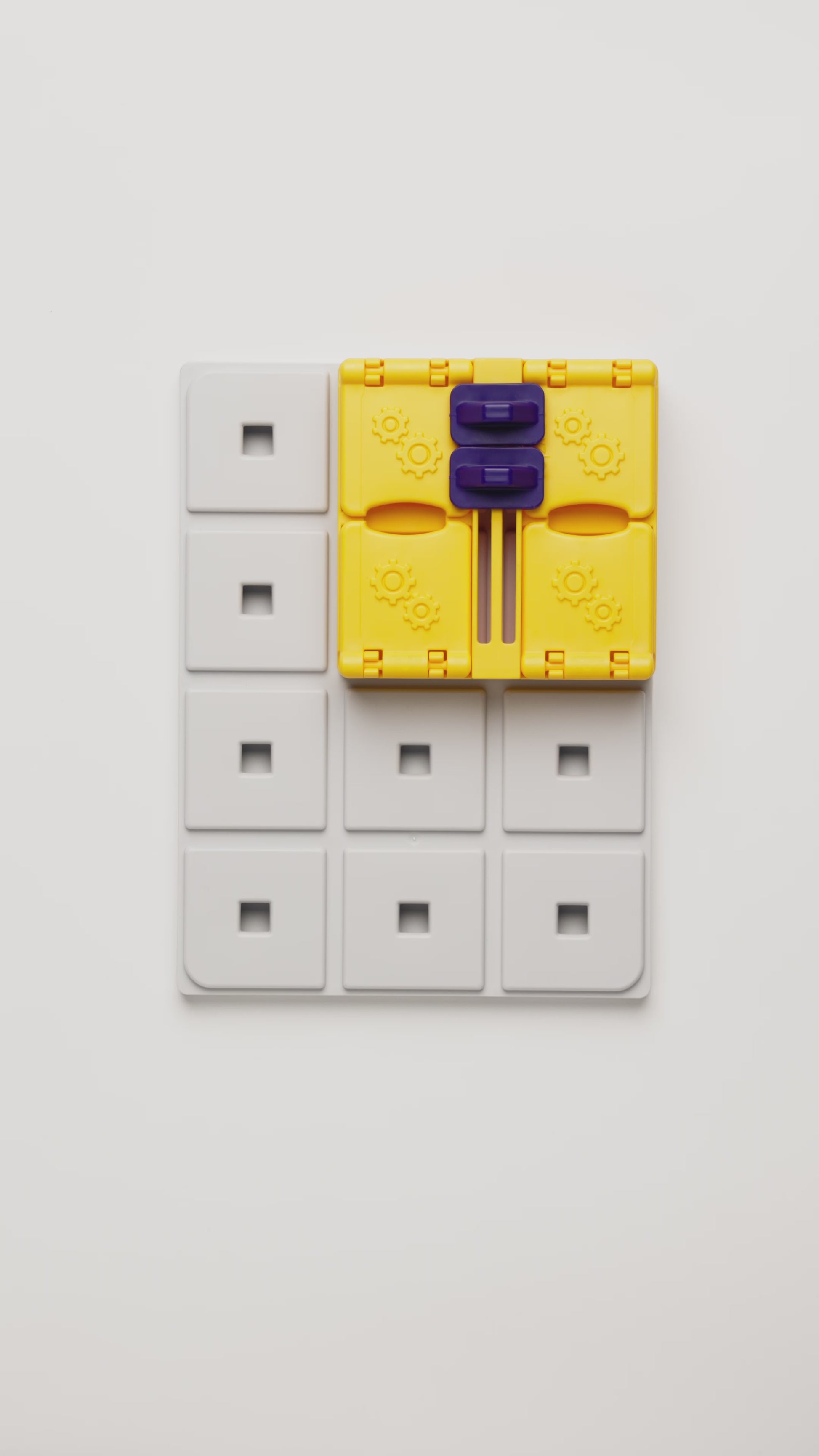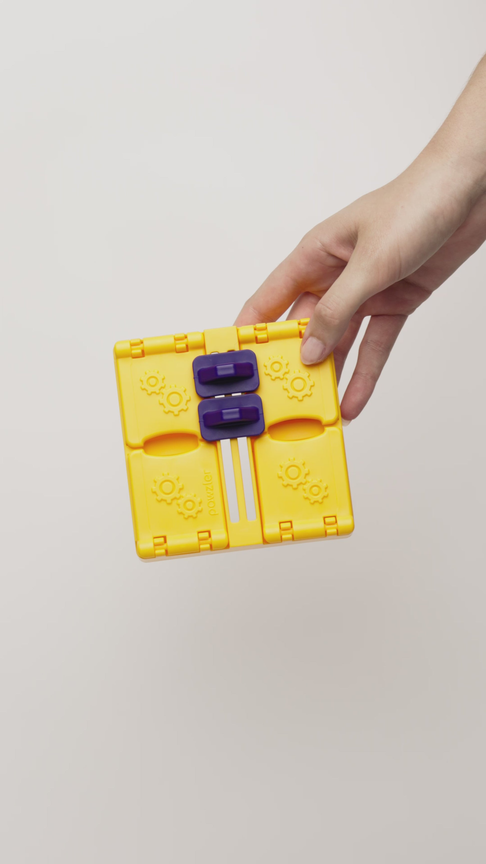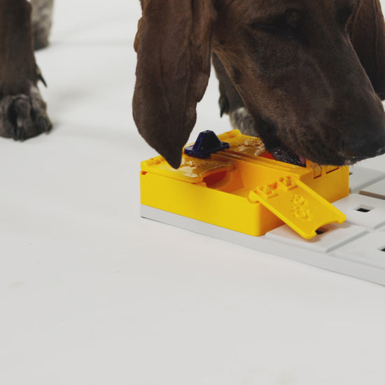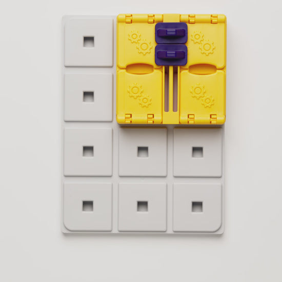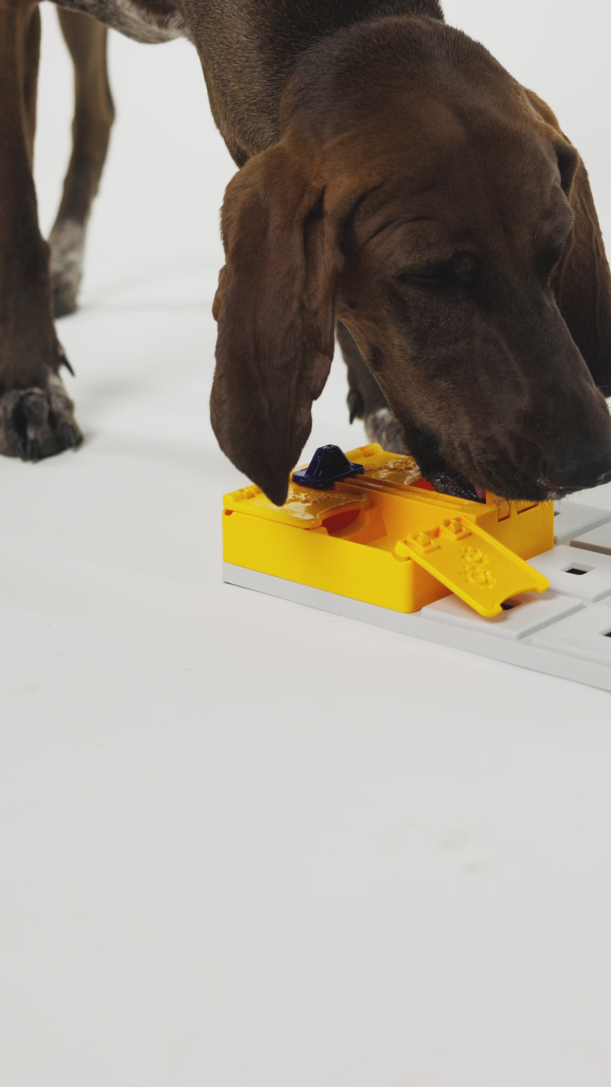 Piper is a pawzle that takes up four spots on the base and offers four treat-hiding compartments. It requires unlocking the sliders before lifting the lid to uncover the treats beneath. Piper allows you to change its difficulty as your dog develops! Start by removing both sliders and make Piper an (easier) option, similar to just having four Zoey pawzles. Then add one or two sliders (included with each pawzle) to lock the lids and make things increasingly difficult. The slider can be unlocked with a dog’s nose, tongue, or paw.